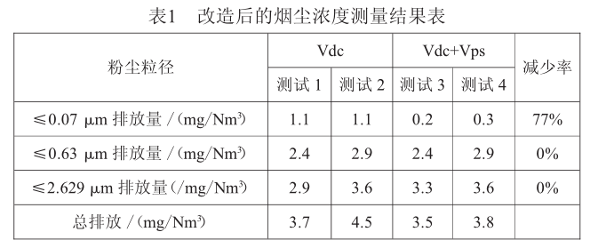在整個測試過程中,除塵器其他電場供電電源的參數(shù)保持不變,脈沖電源采用基礎(chǔ)、基礎(chǔ)+脈沖兩種方式相結(jié)合的運行方式。根據(jù)表1的4次測試能夠看出,增加脈沖電源后,對粒徑小于0.07 μm顆粒的除塵效果非常明顯,減少率高達77%,而對其他兩種粒徑粉塵的去除效果并不明顯。因此,脈沖電源適用于微細粉塵的脫除,可大大提高除塵效果。